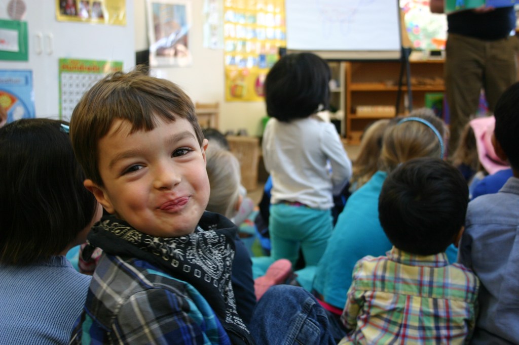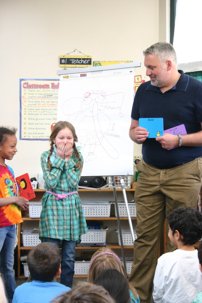 I had seen Parr’s books on the bookstore and library shelves and I bet you have, too. They stand out for their simplicity, thick black lines, and raucously bright primary and secondary colors, not to mention some of his titles. I’m not sure we had read any, at the time, though, so I checked some out from the library and then each of my kids bought a Todd Parr book to have signed at the event. I have the most adorable photos of both my kids, in their classrooms, laughing at one of Parr’s comment. (Will I be able to find these photo for you? Yes, I did!) This about sums up the event for me, which is that Parr was wonderful with the kids: funny, sincere, and calming and definitely had his elementary school shtick going on. He was also pleasant and professional, which I appreciated, rushing about making sure drawing boards were set up, kids were seated waiting in circles, and water bottles placed in key locations.