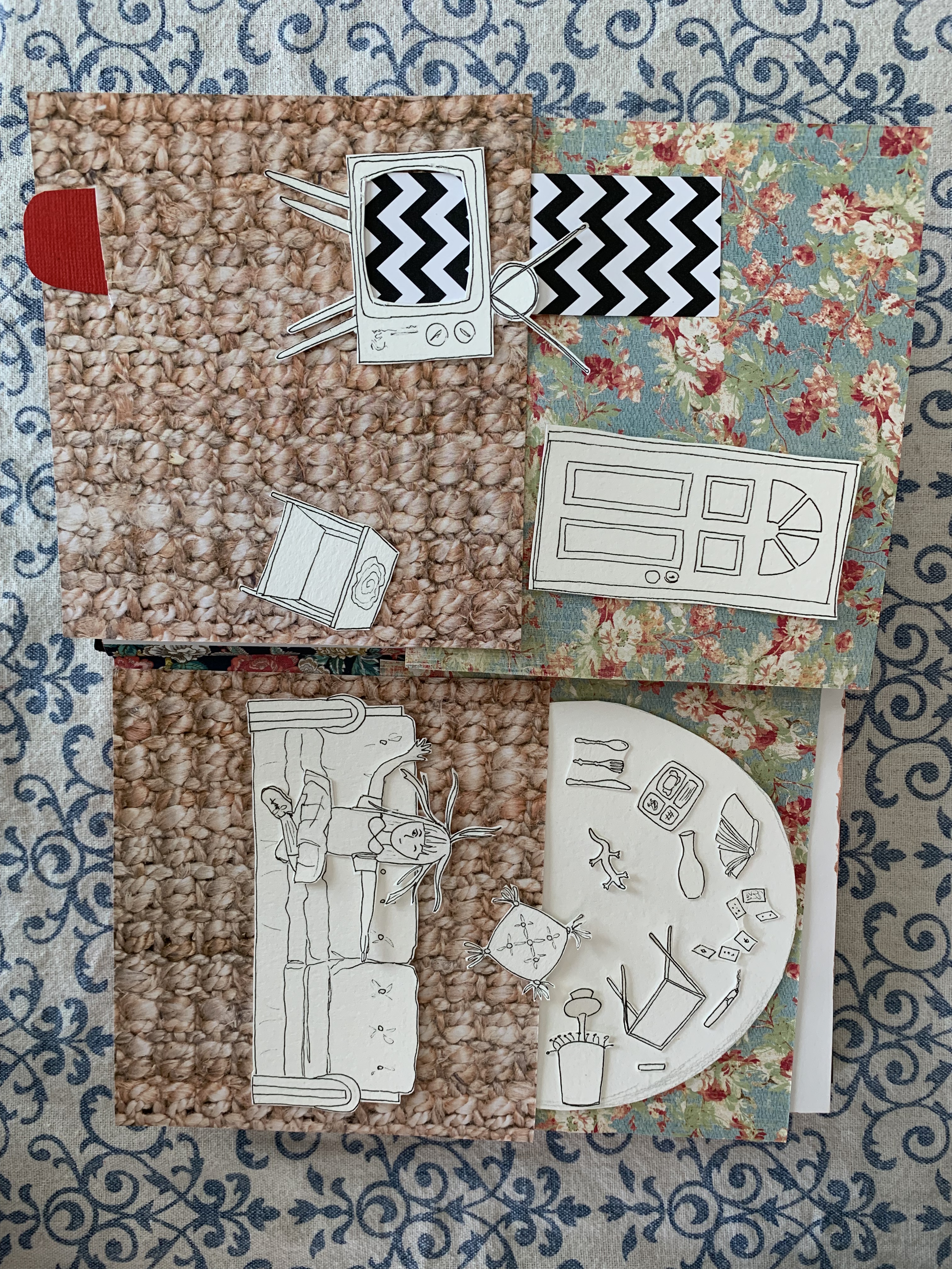 Lo and behold, the pandemic has taught me something and darned if I am not actually doing the altered book project with my students. After doing some basic sketching and contour drawing in class, while diving into charcoal and ink-with-watercolor, I set them their weekly tasks of finding the right sort of book, ripping it up, repairing it, etc. This week we are all supposed to be doing out first page(s) of our themed books. My theme is “Heroines of Juvenile Fiction” and my first page (which is done, actually) is Matilda (as in Roald Dahl’s Matilda). The pull-tab makes static on the “telly” and the wheel makes things levitate around the room. I used collage and ink-with-watercolor to pull it off. (I have demanded that they give me a theme, at least ten different techniques/mediums, at least ten original drawings/paintings, and at least six interactive elements.) They are almost as enthused as I am. I have a lot of passion about some things.
