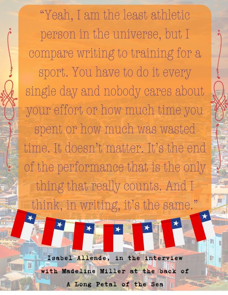 “Yeah, I am the least athletic person in the universe, but I compare writing to training for a sport. You have to do it every single day and nobody cares about your effort or how much time you spent or how much was wasted time. It doesn’t matter. It’s the end of the performance that is the only thing that really counts. And I think, in writing, it’s the same.” -Isabel Allende, in the interview with Madeline Miller at the back of A Long Petal of the Sea
