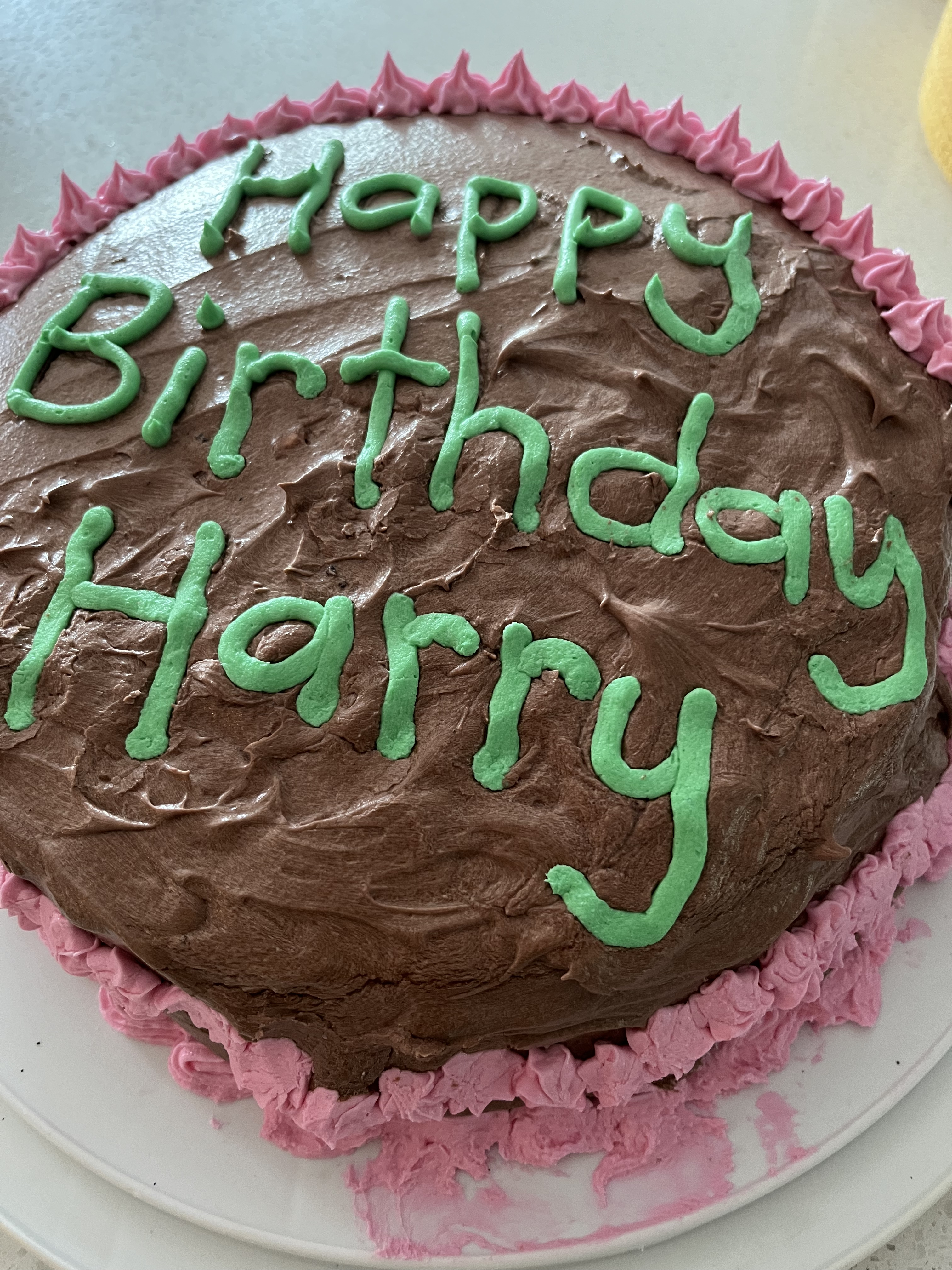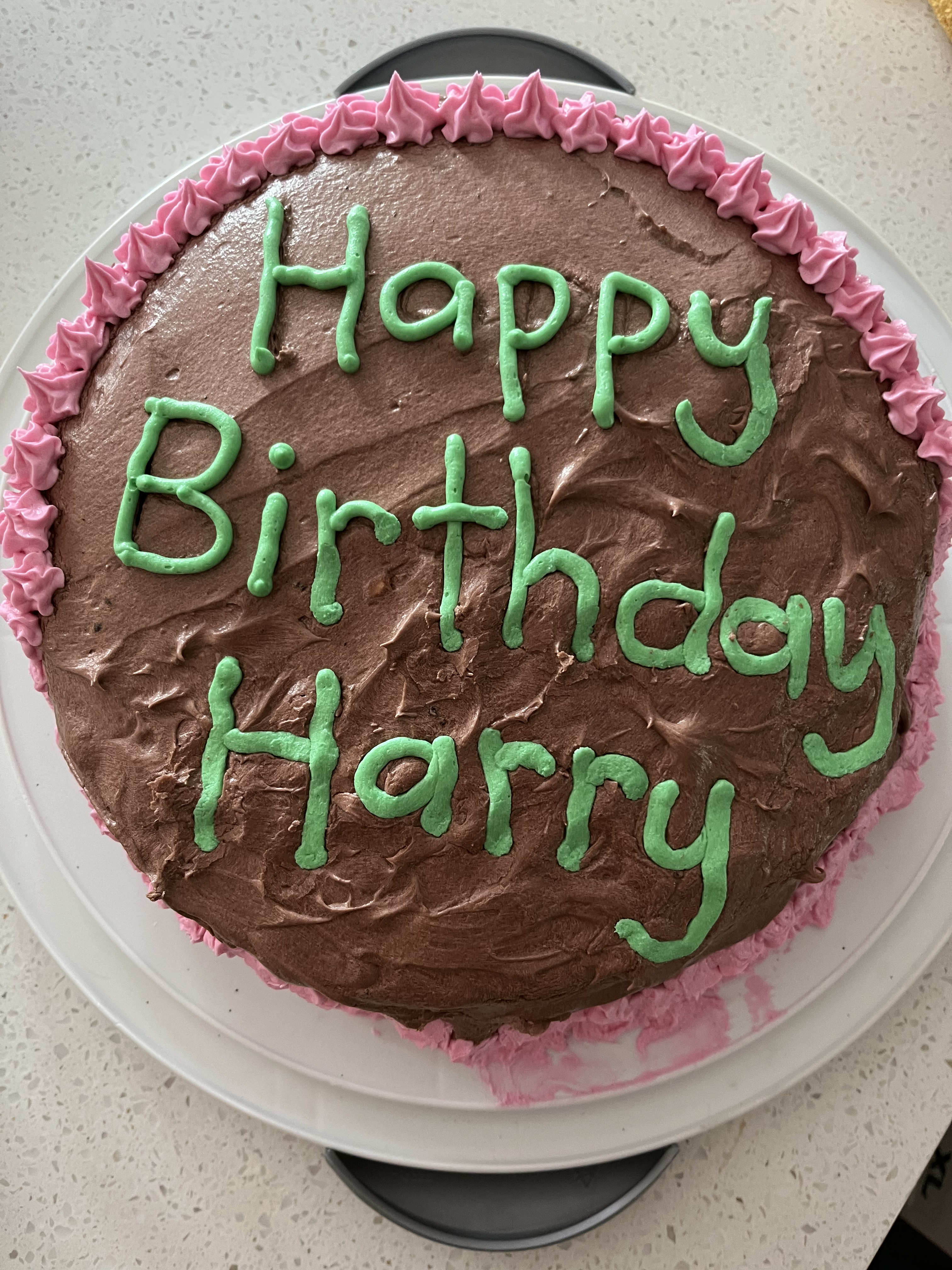 - With the green frosting, write “Happy Birthday Harry” on the cake so that it is a little closer to the edges of the bottom part.
