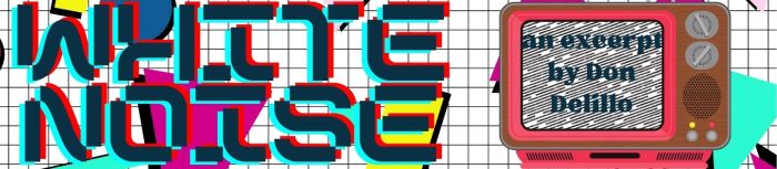 - excerpt from White Noise. White Noise is a novel by Don Delillo, a farcical 80s classic, and this scene with the MC talking to his teen son IS farcical and also pretty brilliant as a piece of writing.
